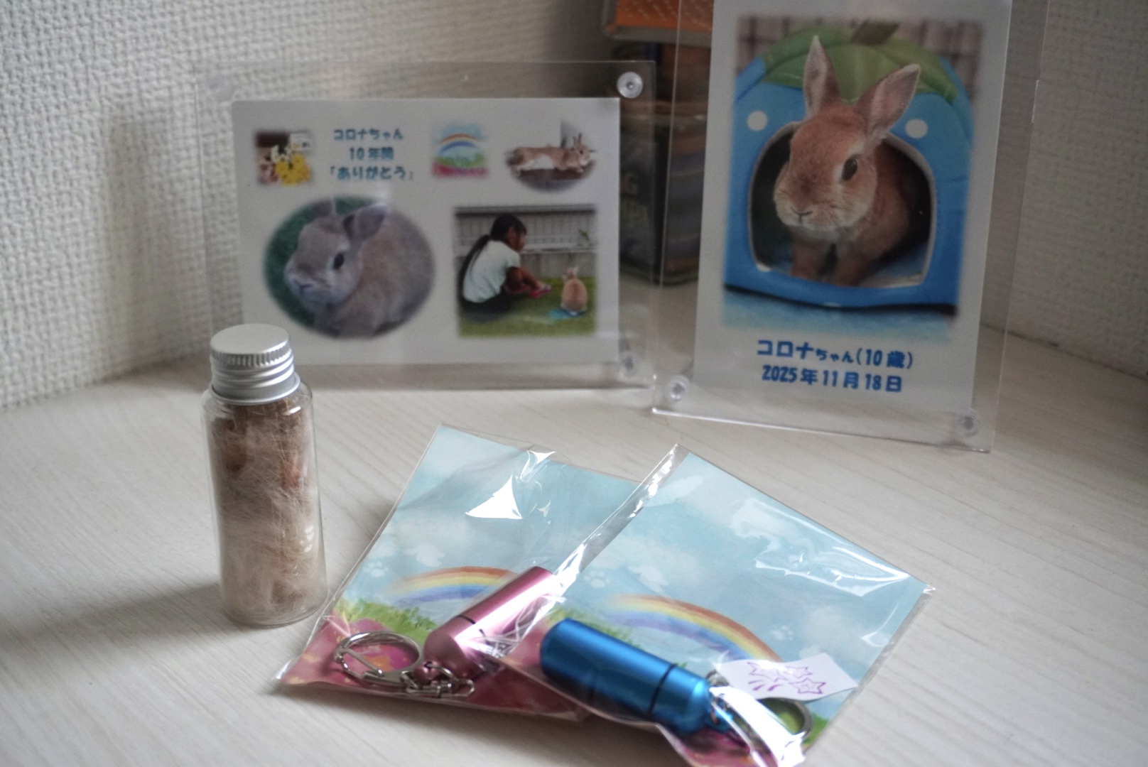 さらに数日すると、郵送でコロナのメモリアルフォトと分骨カプセル、ふわふわの毛が入った入れ物が届きました。毛は茶〜白ときれいにグラデーションされて入れてあるし、メモリアルフォトのコロナがどれも可愛いしで、もう胸がいっぱい!!