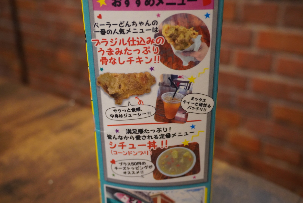 このチキン、めっちゃくちゃジューシーで本当にミックスティーと相性バッチリです。5歳の息子が大好きなシチュー丼も載っていました。シチュー丼って他のパーラーではあまり見かけないんですが、どんちゃんのオリジナルメニューなのでしょうか。